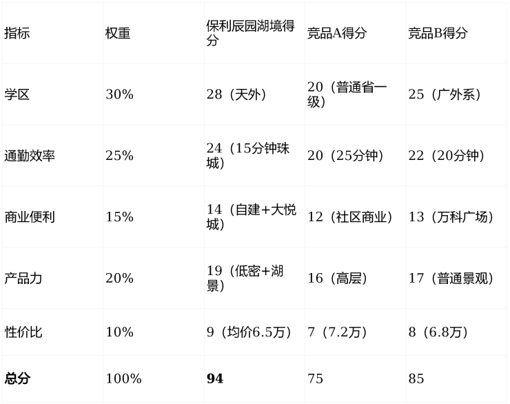 竞品对比:与竞品A相比,保利辰园湖境学区更优;与竞品B相比,产品力更强;