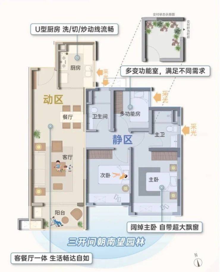 预算有限的年轻夫妻或三口之家,不妨看看约 90㎡的 2+1 房。这个户型最亮眼的就是三开间朝南,客厅、主卧、次卧都能晒到太阳,每天清晨被阳光叫醒的幸福感,是朝北户型比不了的。U 型厨房设计也很贴心,洗、切、炒动线分明,两个人在厨房忙活也不会拥挤,再加上卧室的大飘窗,不仅延伸了空间感,还能打造成小书桌或储物区,实用性直接拉满。