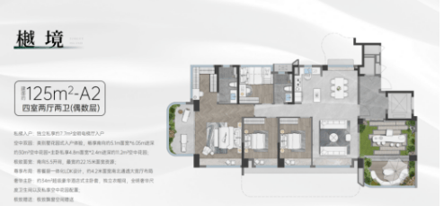 答:在售户型为 82㎡-110㎡-125㎡三至四房,精装修交付,目前加推 6 栋,部分户型空中花园面积达 20-24㎡。