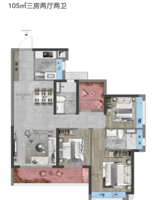 建面105㎡三房两卫是刚需入门优选,总价367万起,户型方正做到动静分离