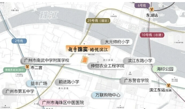 地铁:家门口规划25号线仲恺路站,毗邻2号线市二宫站(1站达江南西/海珠广场,2站抵公园前/昌岗),东侧10号线滨江东站(1站东湖,3站广州大道中);