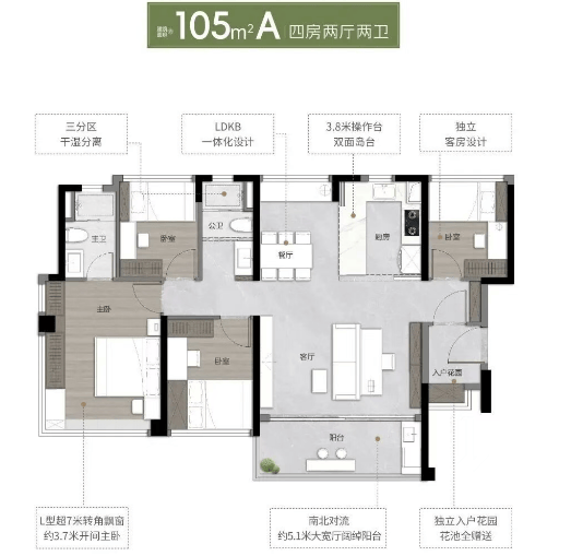 其中,77㎡户型做到三面宽南向,配备 270° 全景舱主卧,客厅采用 LDKB 一体化设计,空间利用率远超同面积段产品;88㎡户型分为 A、B 两款,A 户型带约 4.7 米大阳台与双采光大主卧,B 户型主卧附赠步入式衣帽间,7.3 米通铺阳台连接次卧,兼具实用性与舒适性;103㎡户型拥有独立入户花园与 270° 瞰景阳台,105㎡户型做到南北对流,客厅 5 米大宽厅搭配 L 型超 7 米转角飘窗;135㎡户型则为南北通透双阳台设计,5.25 米宽厅与 5.45 米大阳台相得益彰,主卧开间达 3.6 米,空间尺度媲美豪宅。