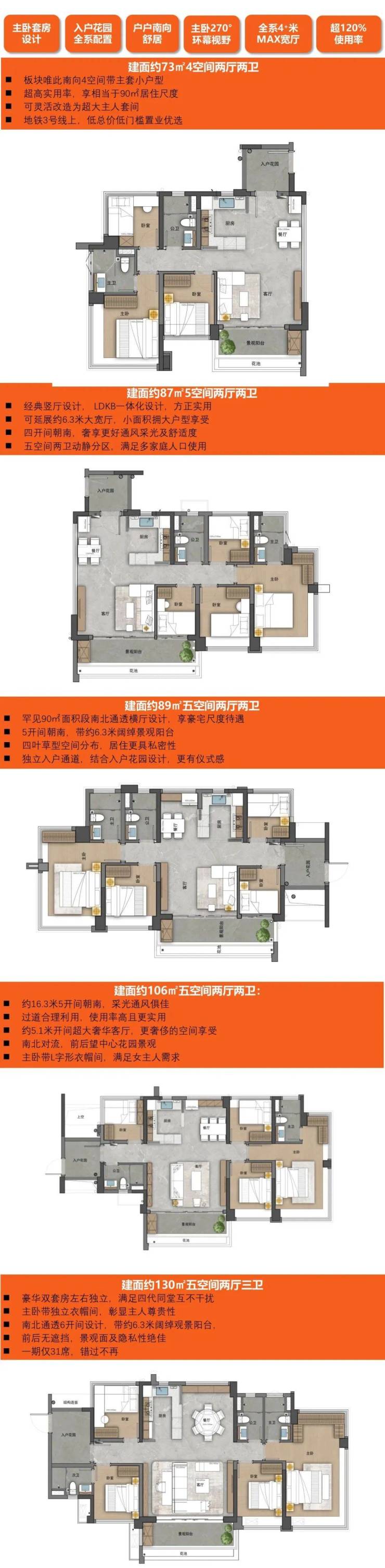 户型面积:建面约73-130㎡全南向3-5空间两厅两卫