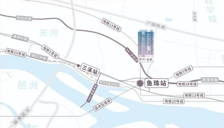 项目距离地铁5号线 & 13号线鱼珠站仅约400米,步行8分钟左右。5号线一路向西,1站到金融城,2站直达琶洲;13号线则串联新塘、增城,未来二期贯通后通达性更强。对在琶洲电商总部、金融城写字楼或珠江新城工作的上班族来说,通勤时间基本控制在20-30分钟内,堪称“地铁红利盘”。