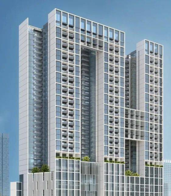 中洲紫轩整体走的是现代简约风,外立面采用公建化全玻璃幕墙设计,搭配双层中空隔音隔热玻璃,不仅提升了建筑颜值,也有效隔绝外部噪音(毕竟靠近主干道),同时保证室内采光与视野。