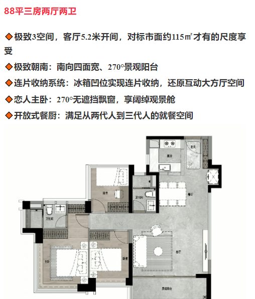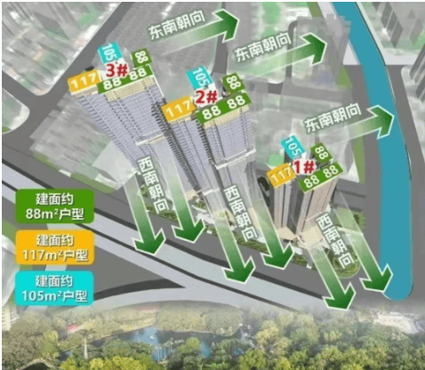 项目作为超新规标杆项目,户型以 “海珠最高使用率、全南向布局、广府生活适配” 为核心亮点,涵盖 88-117㎡三至四房户型,从刚需三房到改善四房全覆盖,满足不同家庭阶段的居住需求。户型设计遵循 “空间最大化利用 + 广府生活习惯” 原则,通过多阳台、飘窗、花池等拓展空间,同时采用 “北高南低、一字型排开” 布局,确保全部户型为东南或西南朝向,兼顾采光、通风与景观视野。