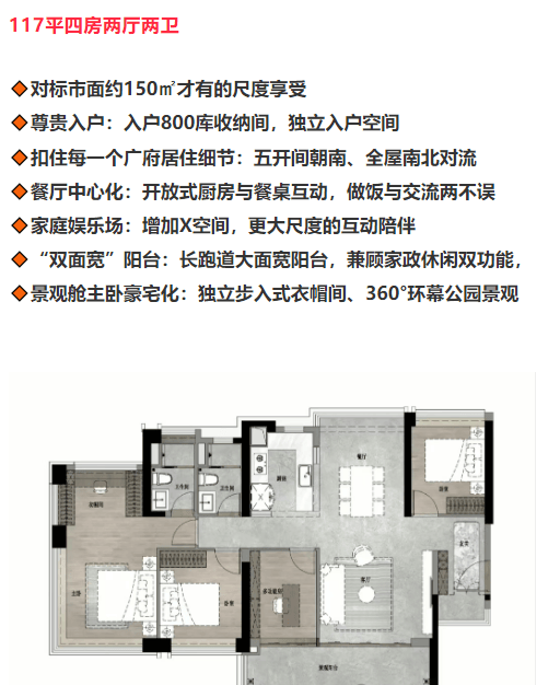 主力户型亮点突出:88㎡三房两厅两卫,极致空间设计,客厅开间达 5.2 米(对标市面 115㎡户型尺度),南向四面宽 + 270° 景观阳台,主卧配备 270° 无遮挡飘窗,连片收纳系统(冰箱凹位设计)还原互动大方厅,开放式餐厨满足多代人就餐需求,适合三口之家;105㎡四房两厅两卫,改善明星户型,五开间朝南 + 全屋南北对流,仪式感入户玄关(避免 “一箭穿心”),餐厅中心化设计(做饭与交流兼顾),增设 X 家庭娱乐空间,双面宽跑道阳台(兼顾家政与休闲),主卧套间带阳光衣帽间 + 360° 环幕景观,适合二胎家庭;117㎡四房两厅两卫,终极改善户型,位于小区 C 位,独立入户 800 库收纳间,五开间朝南 + 全屋南北对流,客厅连接大面宽阳台,高层可眺望广州塔与珠江,主卧套间带独立步入式衣帽间 + 环幕公园景观,适合多代同堂或高端改善需求。此外,全系户型使用率为海珠在售新盘最高,较传统户型多出约 10-12㎡使用空间,性价比突出。