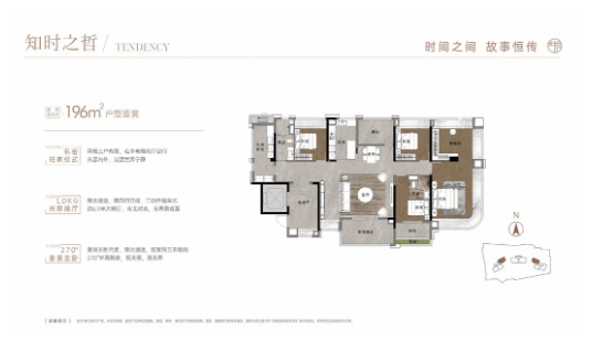 196㎡户型:四房两厅三卫,双主套设计,彰显高端品质,客厅、卧室、阳台等开间尺度比同面积段产品更大,空间感更强。样板间由梁志天团队设计,设计灵感借鉴爱马仕等奢侈品创意,色系以原木风为主,清新典雅,细节之处尽显质感;室内多处采用弧形圆角设计,吊顶、主卧飘窗、洗手间墙面等均有弧形元素,视觉体验丝滑,提升居住舒适度;双主套设计,均配备独立卫生间,保障家人之间的私密性,适合高端改善型家庭居住。