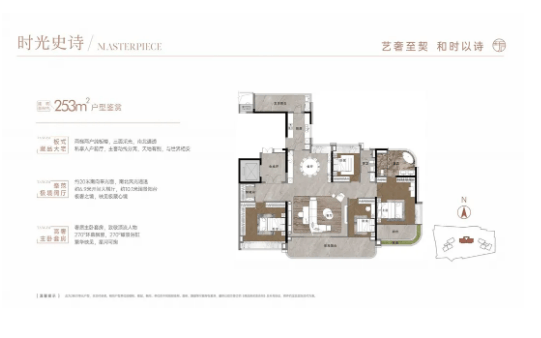 253㎡户型:四房两厅三卫,楼王单位专属户型,仅分布在2栋楼王,两梯两户设计,圈层纯粹,层高达到3.3米,空间感极强。竖厅设计,南北对流,采光通风俱佳,配备10米长阳台,视野开阔,可俯瞰社区园林及周边景观;主卧与主卫均采用270°弧形采光面,视野、采光一流,主卧配备独立衣帽间、卫生间,彰显高端格调;其余卧室均为大户型设计,配备飘窗,采光良好,适合高端圈层终极置业、多人口家庭居住,彰显居住品味与圈层地位。