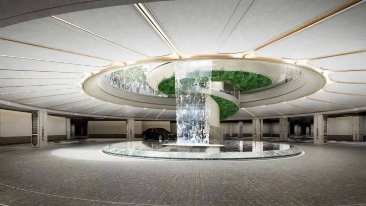 车马光厅:为了提升居住体验,车库内部砍掉了超50个车位,打造了一个直径约20米的圆形“车马光厅”,引入阳光、瀑布和自然元素,使每一次驱车回家都成为一次沐浴自然的艺术之旅。