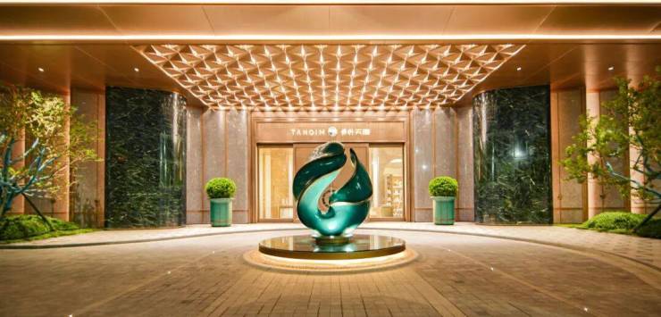 壮观门楼:约6.3米高、50米宽的东门楼,借鉴法国凡尔赛宫的迎宾树阵列,搭配4米高的柱状罗汉松阵列和“绽放”的白玉兰,顶部悬挂定制星空纹吊灯,营造出一种庄重而优雅的氛围。