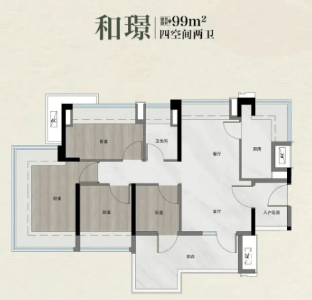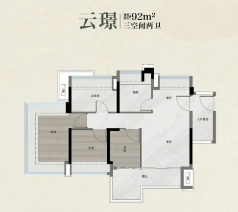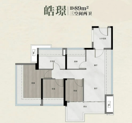 越秀·鸿璟台主推建面约89至122㎡的三至四房,全部采用新规下的全南向布局。以89㎡户型为例,四开间朝南已是标配,三个卧室均布置在南侧,厨房与卫生间则集中在北面,动线清晰、秩序分明。客厅开间不含墙体已达3.4米,搭配L型阳台,视觉和实际使用都显宽敞。92㎡户型则通过转角玄关提升私密性,其L型长阳台被赋予多种可能:洗衣家政区、茶室、小型健身房,甚至可局部纳入次卧扩大使用面积。而109㎡和122㎡的板楼产品,得益于南北对流设计,主卧套间与客餐厅形成真正的穿堂风,采光通风效果扎实。所有户型均未设置飘窗赠送,但通过阳台、入户花园等合规方式提升实用率,部分产品得房率超过100%。
