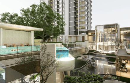 项目自带约5500㎡公服配套,涵盖托儿所、社区商业街、肉菜市场等基础功能,日常买菜、接送孩子下楼即可完成。更特别的是,这里引入了板块首个酒店式会所概念——大面积玻璃幕墙包裹的“精致盒子”,内部规划有悬浮感游泳池、赛事级室内篮球场、瑜伽室及多功能会客区。归家动线也经过精心设计:双首层抬高门楼、水景端景、弧形立柱与金色天花灯带,营造出类似高端度假酒店的仪式感。园林方面采用低密立体布局,结合岭南元素打造多层次绿化,既与外部城市界面形成自然隔断,又为业主提供静谧的休憩空间。