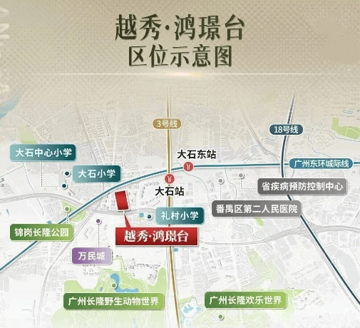 越秀·鸿璟台位于番禺大石板块南大干线北侧,距离地铁3号线大石站步行约700米。这个距离不算近也不算远,日常通勤完全可接受。坐3号线,1站到万博,6站就能抵达珠江新城;如果未来广州城际大石东站启用,2站琶洲、3站金融城也变得触手可及。更值得留意的是规划中的26号线群贤路站(环评已通过),它与3号线平行,未来有望进一步分流高峰期的客流压力。自驾方面,南大干线和新光快速就在家门口,一脚油门半小时内能覆盖长隆、万博甚至琶洲核心区域。项目还在临近主干道一侧设置了约2500㎡的防护绿地,相当于一道天然隔音屏障,在便利与安静之间做了平衡。