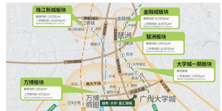 越秀大学星汇锦城坐落广州番禺国际创新城大学城二期核心腹地,是广州南部科创、人文、居住三大能级叠加的核心价值板块,承接大学城千亿科教产业红利,依托南大干线城市发展主轴,联动万博商务、琶洲数字经济、珠江新城主城核心三大城市极核,是广州向南扩容、番禺价值升级的核心主战场。板块定位广州国际科教创新枢纽,汇聚华南理工大学国际校区、暨南大学、广州中医药大学等顶尖高等院校,科研产业、高端人才持续导入,城市配套逐年加速落地兑现,土地稀缺性不可复制。相较于番禺其他近郊板块,国际创新城兼具大学城百年人文底蕴、科创产业增长潜力、主城便捷通勤距离、低密舒适居住环境,长期保值增值属性强劲,同时避开主城高密度拥挤短板,以低容积率、高绿化、全龄配套打造宜居宜业宜学大城,是 2026 年广州刚需置业、长期资产配置首选核心板块。随着南大干线全线贯通、片区学校全面开学、路网持续完善、商业逐步成熟,板块价值正进入快速上升通道,未来城市界面、人居品质、房产流通性都将持续跃升,土地与房产双重稀缺价值不断凸显。