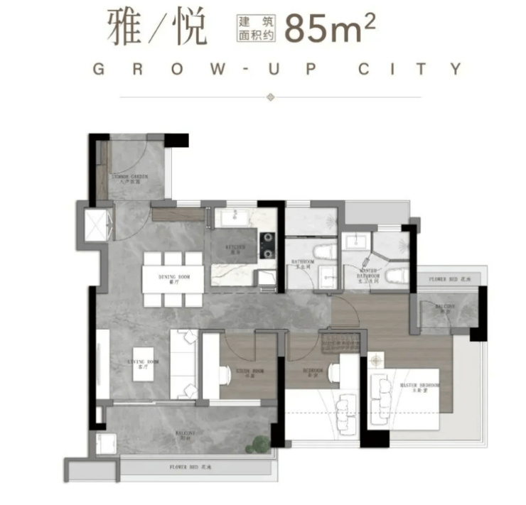 84㎡三房两厅两卫,南向四开间采光面长达 11.1 米,主卧搭配 360° 无立柱全景飘窗,无遮挡观景视野,动静分区合理,双卫设计适配三口之家日常居住,实用性与舒适度兼备。