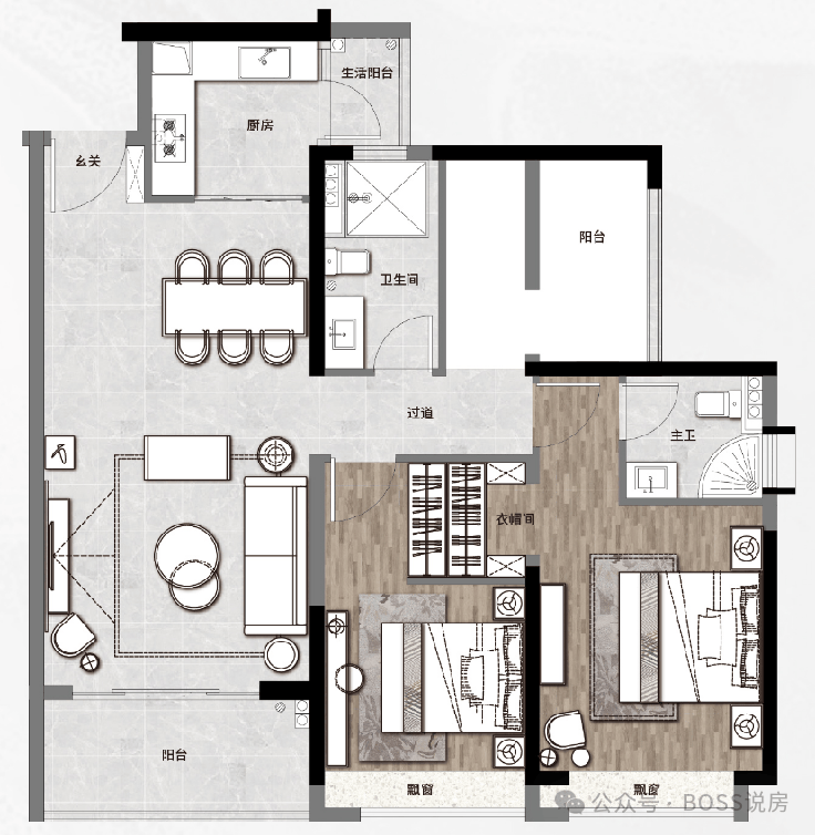 该户型设计独特,约6.5*4.7米轩阔大横厅设计,更显大气。配置约6.5米观景大阳台,享受一线山湖景观。主卧面积约30平方米,贴心预留衣帽间空间,双阳台配置,南北通透,动静分区。
