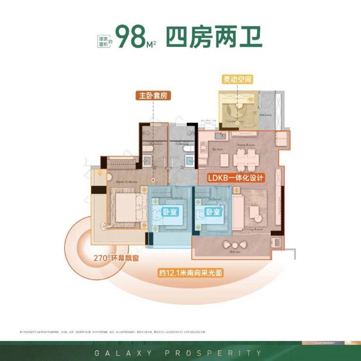 建面约98㎡四房两厅两卫(B1户型):成长型家庭的优选。在百平方米内实现四房功能,四开间采光,预留S墙收纳系统,空间灵活多变,可满足二胎家庭或居家办公的多场景需求。