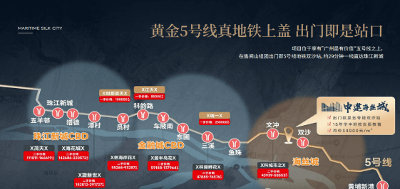 中建海丝城位于广州海丝城板块,处于临港经济片区,是广州市沿江东进发展战略的重要节点。项目与地铁 5 号线双沙站直线距离仅约 50 米,与 13 号线双岗站直线距离不到 500 米,2 站可达鱼珠 CBD,5 站到金融城,6 站至琶洲东区,10 站直达珠江新城,交通极为便捷。自驾方面,广州绕城高速、广深沿江高速等要道纵横交错,为出行提供了高效选择。同时,这里不仅拥有老黄埔稀缺的南向江景资源,北侧还有龙头山森林公园,自然景观优越。
