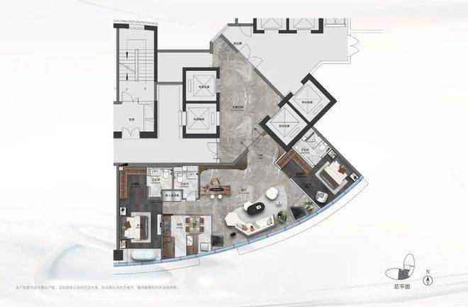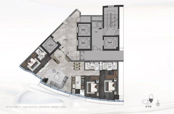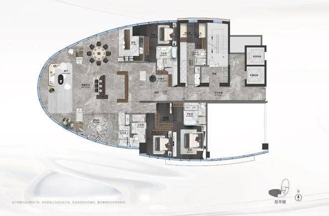 建面约405平方米的“观·天澜”户型,三室两厅五卫格局强调主次卧独立性与会客空间仪式感。超大尺度主卧套房涵盖步入式衣帽间与独立卫浴,形成私密居住核心;双套房客卧满足家庭成员或贵宾留宿需求;客餐厅一体化布局可承载多场景社交活动。建面约357平方米的“观·天赢”户型同样以三室两厅四卫配置,兼顾家庭生活与商务接待功能,强调流畅动线与功能分区。