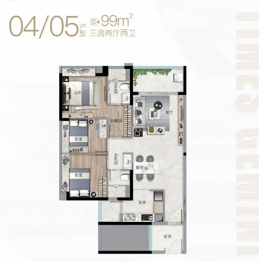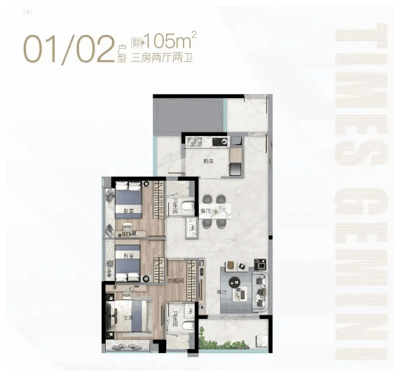 时代珑星共规划两栋楼,分别为 G1 栋和 G2 栋,两栋楼户型设计各有特色,可适配不同家庭的居住需求。其中 G1 栋采用蝶形设计,为两梯六户布局,户型面积段集中在 99-106㎡,均为三房户型,空间布局合理,能满足三口之家或多人口家庭的居住需求,无论是日常居住还是家庭聚会,都能拥有足够的活动空间。G2 栋外观设计略显独特,推出的则是建面约 62-79㎡的精奢小户住宅,户型紧凑实用,功能性强,非常适合单身人士、年轻情侣或刚需过渡型购房者,低总价的优势也让更多购房者能够轻松入手。