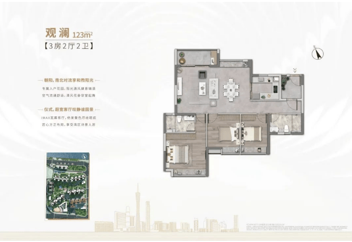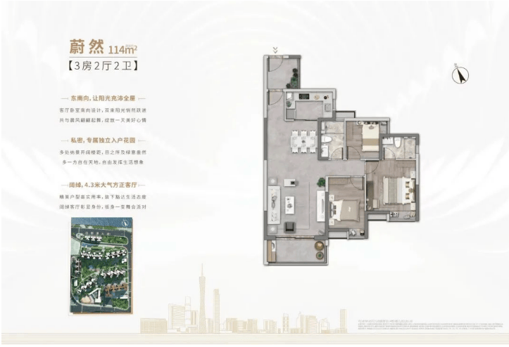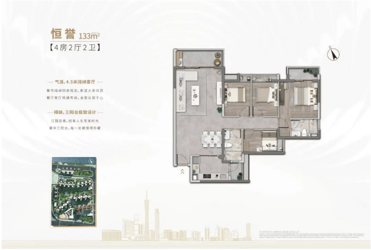 新世界凯粤湾位于广州荔湾区白鹅潭门户综合区,广佛发射线以东、芳村大道以北,北邻珠江。该项目占地面积达370,000平方米,建筑面积1,200,000平方米,容积率为3.0,总共有15栋楼,共3028户,车位比为1:0.8。项目主打建面约80-143㎡的南向江景新品,主力户型包括建面约109㎡全南名校主套三房和建面约122㎡天幕江景学府四房。