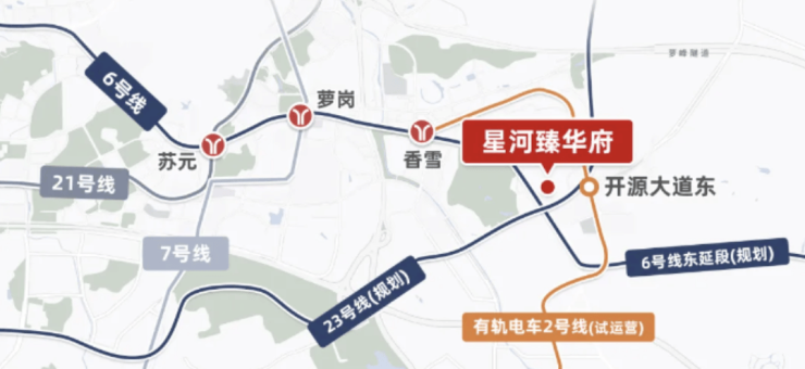 星河臻华府位于开创大道与开源大道交汇点,是科学城东部交通中轴的黄金节点。虽然项目目前距离地铁站约两公里,但未来地铁6号线东延段开通后,最近地铁口将设置在社区周边,步行即可抵达,通勤便捷度显著提升。