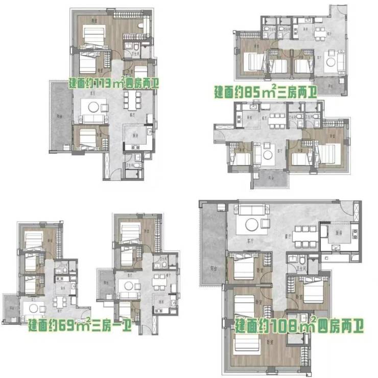 户型分别约69㎡三房一卫;约80-87㎡三房两卫;约108㎡四房两卫;约113㎡四房两卫。