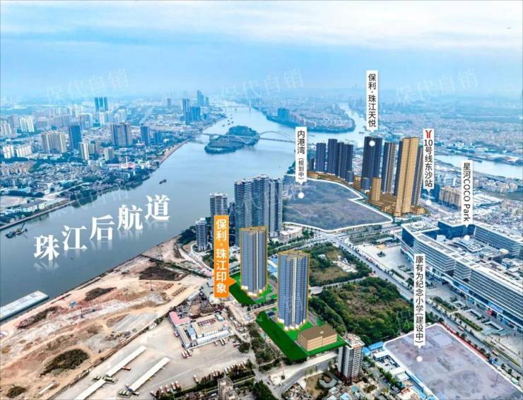 该项目是2024年保利以82亿拿下的东沙地块中的AF060610和AF060617两宗小地块。位于白鹅潭沿江经济带的核心区域,东面紧靠广州幸福湾,北面是快捷路二期,南面靠近健康港星河COCO Park。