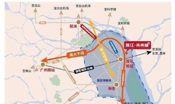 轨道交通规划:区域拥有 8 号线东延段(规划)、17 号线(规划)双地铁线路,以及佛莞城轨(在建)、穗莞深城轨琶洲支线(在建)、广中珠澳高铁(规划)三城轨。建成后,可实现 3 站到琶洲 CBD、万博 CBD,4 站到南站,便捷的轨道交通将极大提升项目的交通便利性和区域价值。