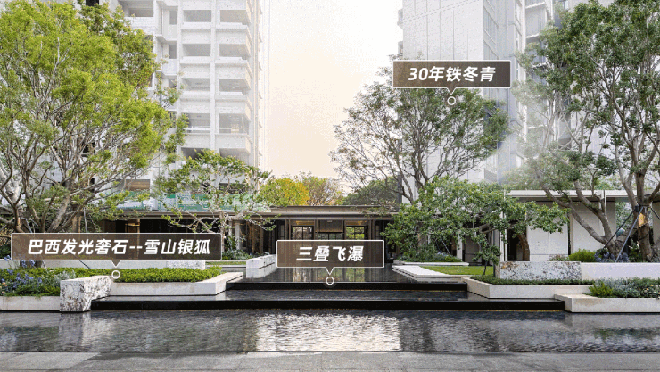 项目以高奢酒店会所标准打造社区配套,足约12米高、横跨两层楼的巨幅照壁拉开归家序幕,放眼全广州,鲜有项目的社区门楼能有如此气势。入户大堂以宝格丽酒店设计风格为灵感,约7米高的艺术移门辅以奢石弧形墙面,以强烈的仪式感,勾勒通往越秀·万博和臻的“玄关”;二进 “南洋海派”高奢酒店归家大堂,往常仅用于豪宅室内装饰的奢石,被大手笔地安在了公区,在细节中拉满了隐奢的生活格调;三进中心水院,当夜幕降临,水景两侧的巴西奢石呈现灯光下跳动的银,与背景叠水流动的光影交织奏鸣,营造出极具质感的居住氛围。