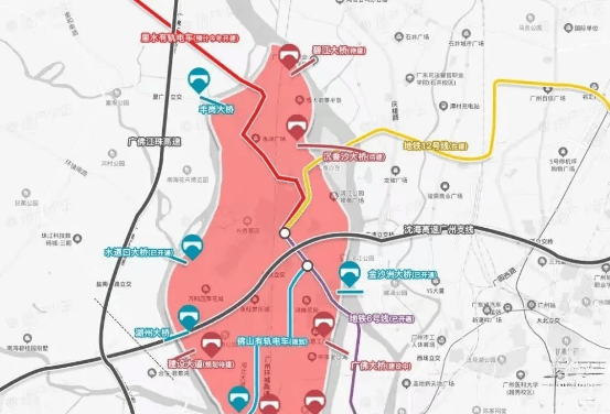 越秀天悦金沙位于金沙洲板块,横跨广州白云与佛山南海,临近荔湾,距广钢新城、白鹅潭等主城区板块通勤距离适中。周边生活配套十分成熟,约 500 米可达永旺商圈,3 公里内有金铂天地、万达广场等超 20 个大型商业体,总规模超 300 万㎡;1 公里内还有广州医科大学附属第一医院等双三甲医院。交通方面,项目距地铁 6 号线浔峰岗站约 2.5 公里,目前依赖自驾或公交接驳,不过广州地铁 12 号线已通车,可缓解 6 号线拥挤问题,广佛大桥有望今年通车并设非机动车道,未来交通便捷度将进一步提升。