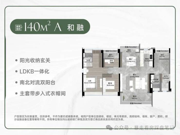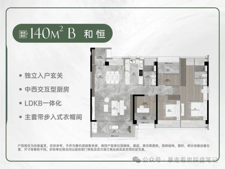 建面约 140㎡四房两厅两卫:全明户型,南北通透,超宽景观阳台,主卧独立衣帽间,适合改善型家庭,兼顾实用性与舒适度