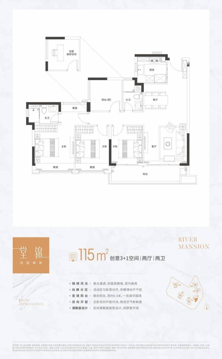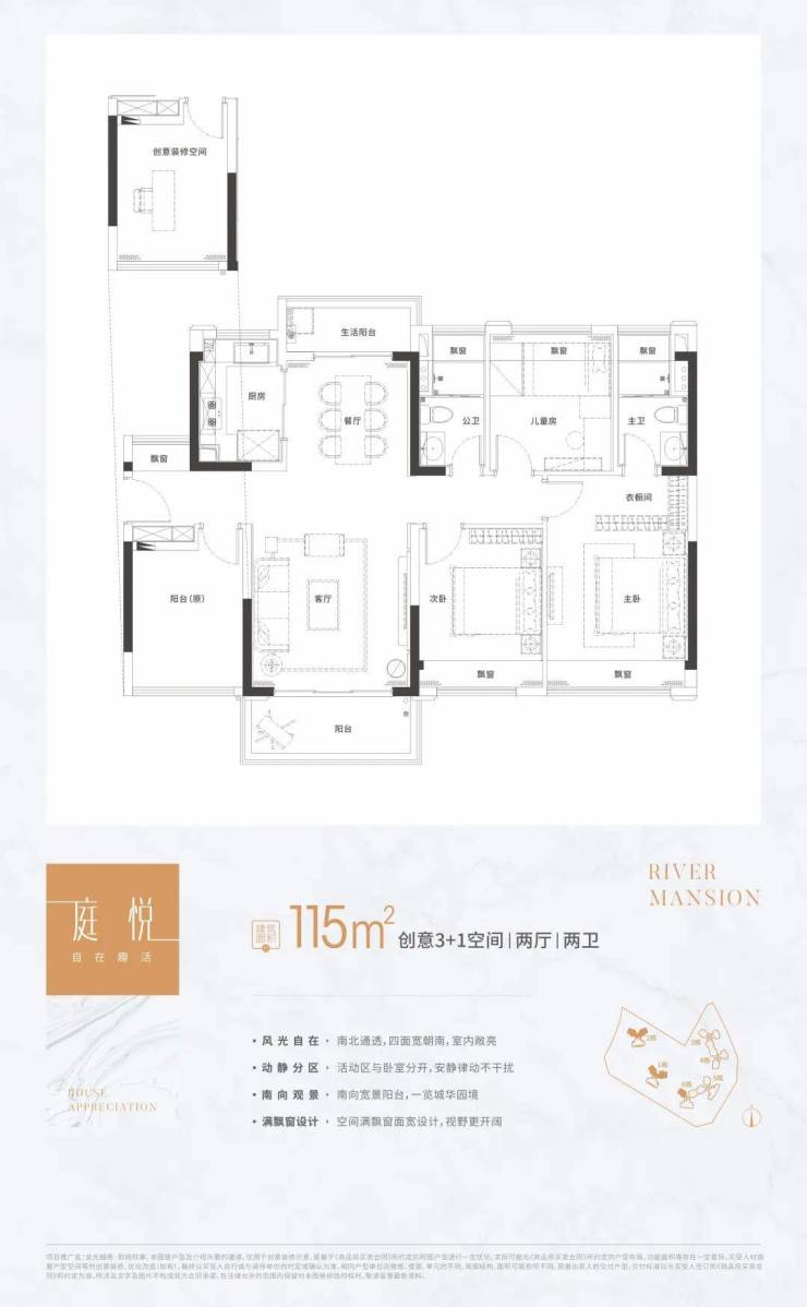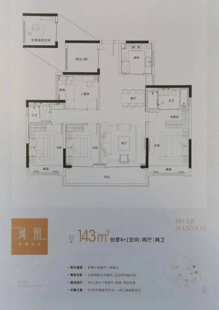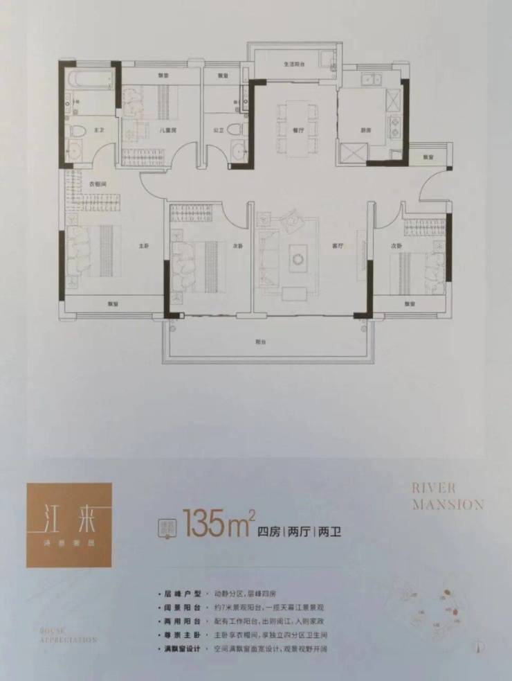 135㎡江来4房户型:一线江景视野,让您足不出户就能欣赏到壮丽的江景。
