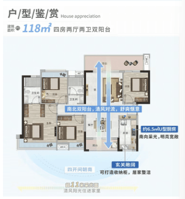 户型设计多采用南北通透及宽阔楼距,主卧及客厅配备270°转角飘窗,大阳台延伸视野,增强自然采光和空气流通。社区整体布局兼顾人居舒适度与景观品质,提供宁静、优雅的生活体验。