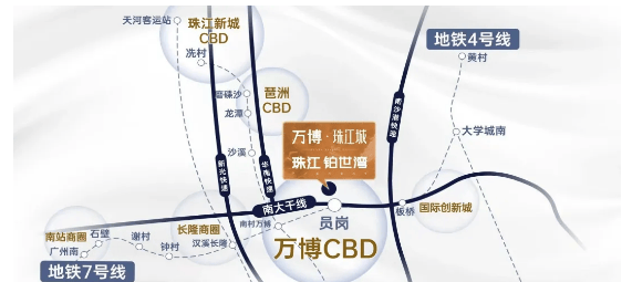 珠江铂世湾的区位优势得天独厚,位于广州城市中轴与南大干线经济带双中轴交汇点,临近万博CBD,享受板块发展的双重红利。万博CBD作为番禺的核心商业区,目前已聚集了众多写字楼、商业体和高新技术企业,成为广州南部的经济增长极,随着产业的不断升级,区域价值也在持续提升。