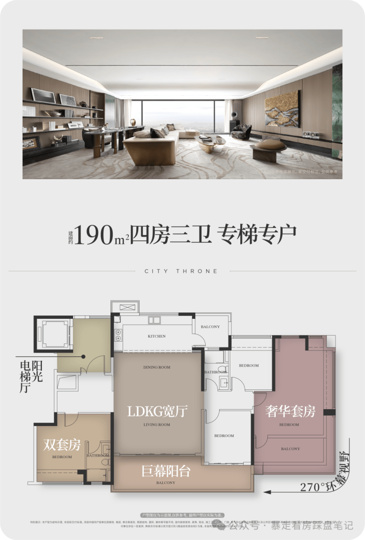 空间:专梯专户,私享约 10㎡独立电梯厅,可打造入户花园、收纳区;主卧 270° 全景飘窗,步入式衣帽间,主卫双台盆设计,奢华感十足;