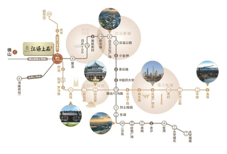 项目坐拥地铁 12 号线(已开通)、13 号线二期(在建)、佛山 8 号线(规划)三线交汇,距 12 号线西洲站仅 300 米,4 站可达白云站,20 分钟直达珠江新城;周边有白云二线、棠槎路等主干道,自驾 30 分钟覆盖全城核心区域。