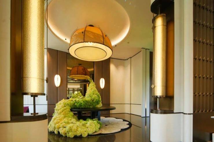 整体看下来,在颐府的打造中,很多地方多弧线设计,比如颐境会客厅、入户大堂、室内天花等。