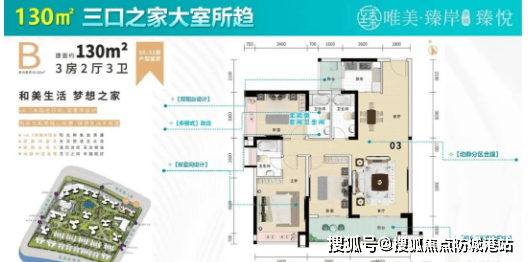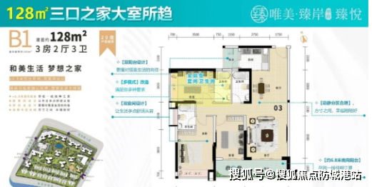 2. 128/130㎡ 3房2厅2卫(130㎡可改4房2厅2卫):该户型为刚需改善全能户型,户型方正大气,南向采光,视野开阔,客厅宽敞明亮,连接景观阳台,能够欣赏社区园林景观;三个卧室均朝南,采光充足,主卧配备独立卫生间和衣帽间,提升居住舒适度和私密性;130㎡户型可灵活改造,增加一个房间,满足家庭人口增多后的居住需求,空间利用率极高,适合四口之家居住。