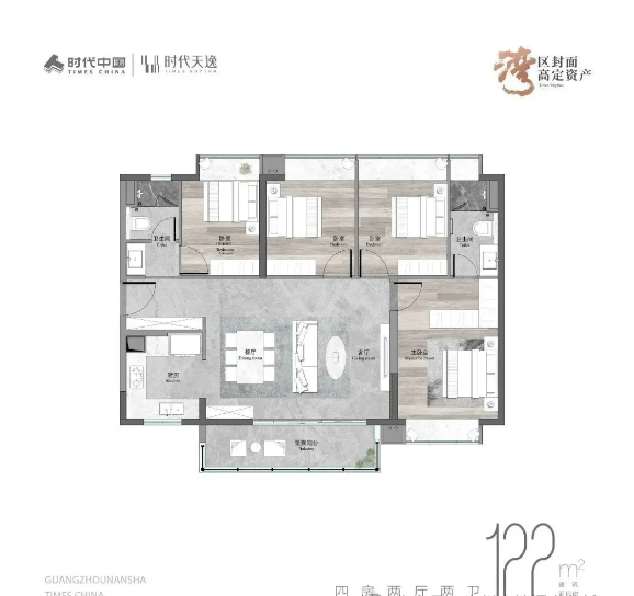 时代天逸由实力雄厚的时代中国打造,于 2022 年 3 月 16 日开盘,目前以精装现房呈现。项目坐落于南沙自贸区庆盛枢纽和区府板块,占地面积约 11 万㎡,建筑面积首期约 38.72 万㎡,商业建筑面积约 12.6 万㎡ 。小区规划 17 栋楼,首期约 2400 户,得房率 80 - 85% ,绿化率 33% ,容积率 4.32 ,总车位 2640 个,车位配比 1:1.1 ,由时代物业提供 2.8 元 /㎡的贴心服务。主力产品为建面约 80 - 88 - 106 - 122㎡的三至四房。