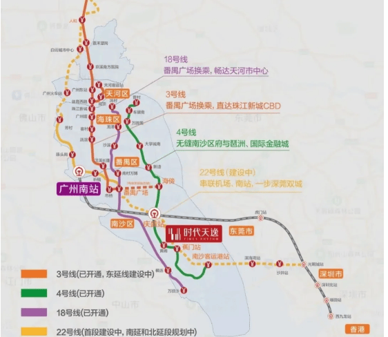 交通便利性是时代天逸的一大突出优势。项目位于地铁 4 号线黄阁站上盖,出站即达小区,无缝接驳地铁 22 号线和广深港高铁。乘坐地铁 2 站可至区府万达,还临近广深港高铁庆盛站,大大缩短了与广州、深圳、香港等地的时空距离,无论是日常通勤还是商务出行、旅游度假,都极为高效便捷。自驾方面,小区旁的南沙城市中轴快速路,时速 60km/h 且全线取消红绿灯,南北走向可快速抵达万顷沙片区,并与深中通道汇合,进一步提升了出行的灵活性。