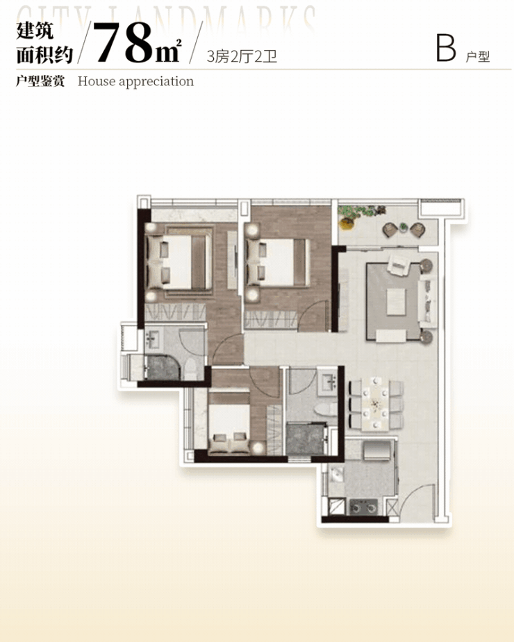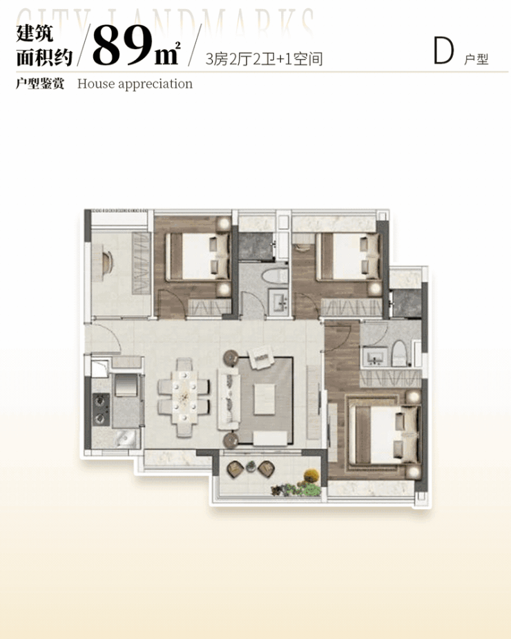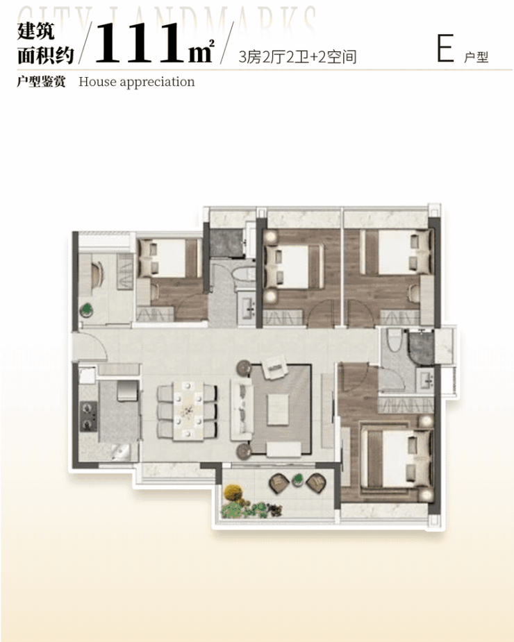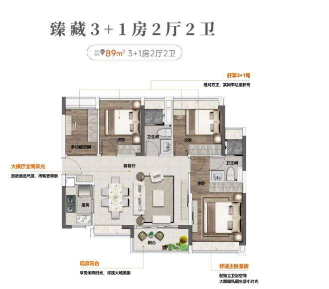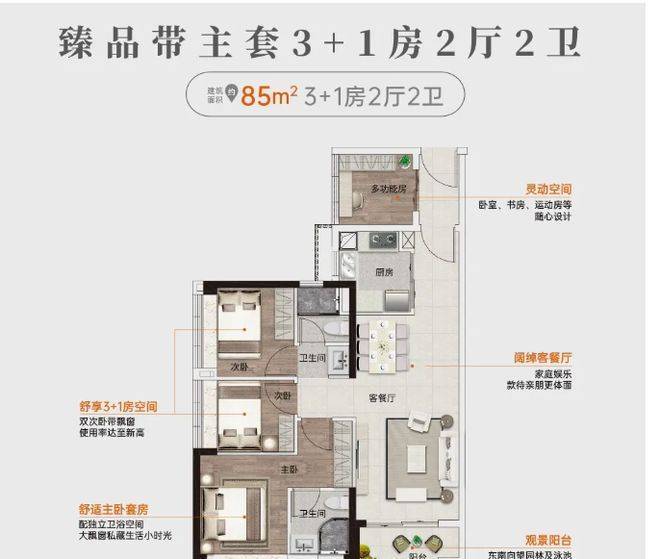 花城云著的户型设计专为刚需人群量身打造,实用率高达 93%,在同类型楼盘中优势明显。建面约 69㎡做到 3 房 2 厅 1 卫,阔绰观景阳台可欣赏中心水景园林美景,主、次卧采光飘窗增加了空间通透感,干湿分离卫浴和 U 型厨房设计实用又贴心。78㎡的 3 房 2 厅 2 卫户型,拥有无遮挡阔境视野,高实用空间且过道无浪费,额外增加收纳空间。85㎡的 4 房 2 厅 2 卫户型,双次卧带飘窗,东南向望园林及泳池,使用率高。89㎡的 4 房 2 厅 2 卫格局方正,独立单边位,南北对流,大横厅设计让采光、通风、观景俱佳,相比周边 85㎡三房,多一房且价格更低。110㎡的 5 房 2 厅 2 卫更是打造私家小花园,满足三胎或三代同堂大家庭需求,性价比极高。这些户型设计合理,充分考虑了刚需家庭的生活需求。