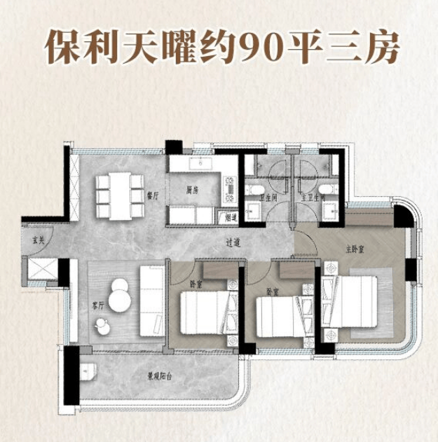 建面约90㎡三房:刚需友好型,紧凑实用无浪费