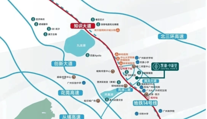 交通便捷是该项目的一大亮点。距离地铁14号线何棠下站仅直线约800米,步行大约600米即可到达。通过地铁网络,可以快速抵达科学城、天河等主要商业区。同时,项目紧靠知识大道和九龙大道,自驾出行同样十分便利。