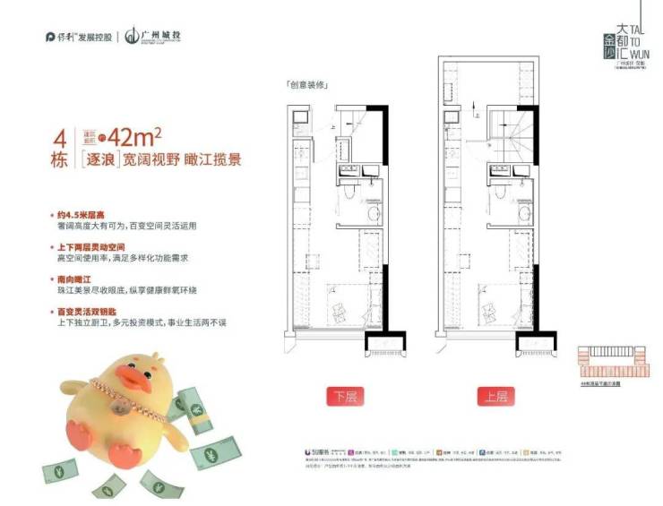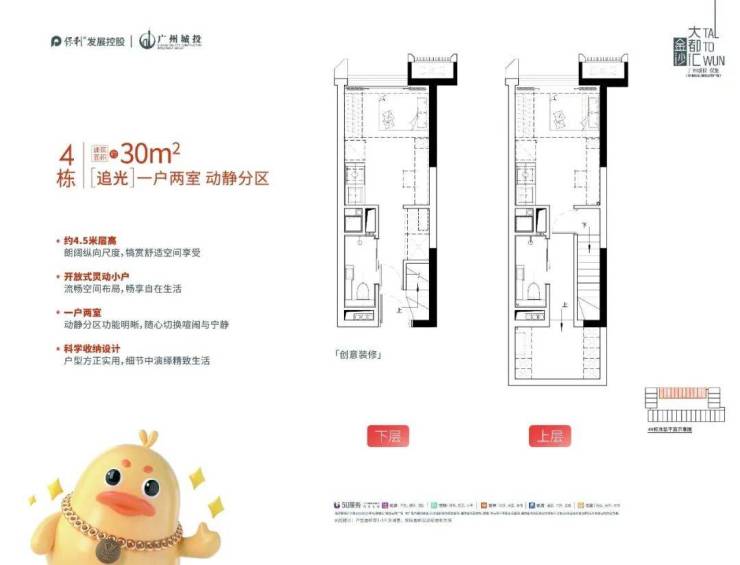 说到小户型,很多人第一反应是“拥挤”和“压抑”,但保利金沙大都汇彻底颠覆了这一认知,将“螺蛳壳里做道场”的空间魔法演绎到了极致。项目主推建面约30-42㎡的灵动空间,却做出了令人惊叹的“双钥匙”复式格局。最核心的亮点在于其约4.5米的卓越层高,这在广州同类型产品中实属罕见。一般的复式公寓层高往往只有4米甚至更低,导致二楼站立困难,而保利金沙大都汇的4.5米净高,让上下两层都能拥有宽敞舒适的居住体验,完全告别压抑感。这种“双钥匙”设计,意味着一套房子拥有两个独立的入户门、独立的水电表系统,上下两层互不干扰,可以分别出租给不同的租客,或者一层自住、一层收租,真正实现“买一得二”的神级操作。官方户型数据显示,通过科学的动静分区和收纳系统设计,30㎡的空间能容纳下一房一厅一卫的完整功能,而42㎡的户型更是能打造出两房两卫的奢适格局。无论是作为年轻人的首套过渡房,还是投资者的收租利器,这种高得房率、高灵活性的产品设计,都完美解决了都市人群对空间利用率的极致追求,让每一平米都发挥出最大的价值,真正做到了“小面积,大享受”。