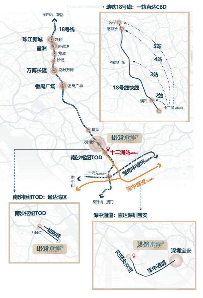 珺筑水岸地理位置得天独厚,距离深中通道广州出入口约 2 公里,这一关键交通节点使得项目能够快速联通深圳前海,尽享大湾区核心区域的发展红利。值得一提的是,其房价仅约为前海的六分之一,却能实现便捷通达,性价比极高。同时,项目距离广州地铁 18 号线十二涌站约 1.2 公里(建设中,广州段预计 2025 年开通)。这条被誉为全球最快的高速地铁,设计时速达 160km/h,作为湾区首条此类地下轨道交通,意义非凡。快线模式下,2 站可达番禺广场,5 站直通珠江新城 CBD,更可接驳中山、珠海等地,为居民提供了高效便捷的城际交通网络,坐享广深中珠四地城际交通核心优势,轻松畅行大湾区。