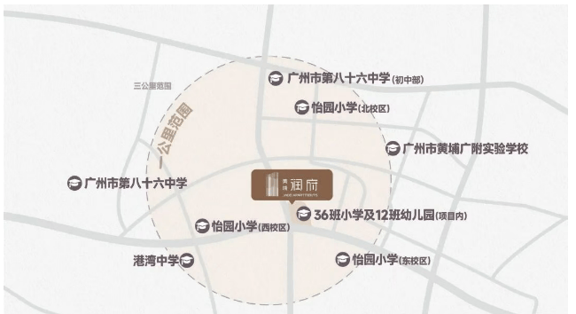 项目自身配建了一所12班幼儿园和一所36班小学,并且签约怡园小学作为合作办学单位。怡园小学具有深厚的教育背景和优秀的师资力量,能够为孩子提供高质量的基础教育。同时,项目周边还有一公里范围内的多所优质学校,如广大附中黄埔实验学校、广州市八十六中学等,进一步丰富了教育资源的选择。