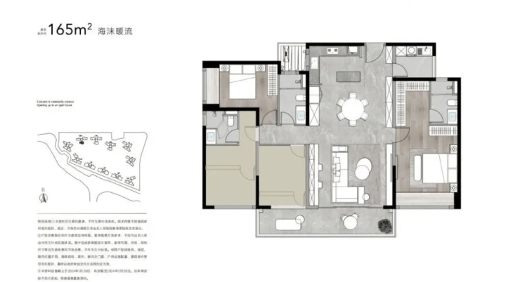 165㎡的4室2厅3卫:主打双卫+家政间的实用配置,南北通透的格局让室内通风效果较好。