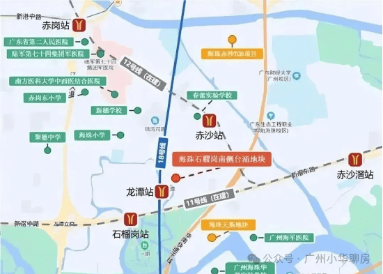 项目坐落于广州中心城区海珠区之心,华洲路旁,西侧为广州海珠湿地公园,南侧邻石榴岗河,距离地铁11号线(在建)和18号线换乘的石榴岗站约1200米,距离琶洲南TOD不到两公里。
